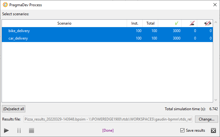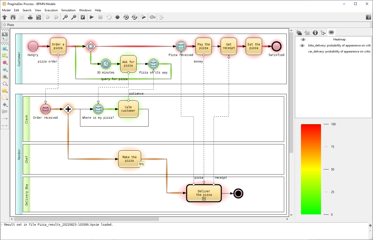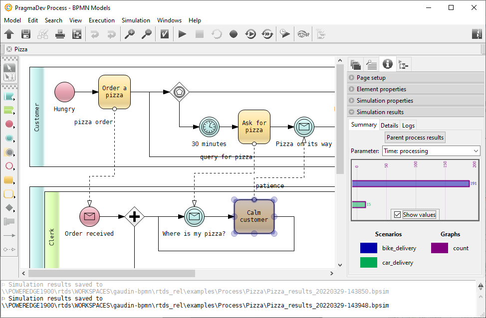 Statistical time and cost information is added to the BPMN model following the BPSim de facto standard. The process simulator runs the different scenarios automatically and produces an evaluation of the time and cost for each process or part of a process. Our simulator is based on our executor and for that reason it is the only one on the market that follows the semantic of BPMN. Check our PragmaDev Process BPMN Simulation with BPSim demo with no resource management, or how to optimize resources in a business process demo: