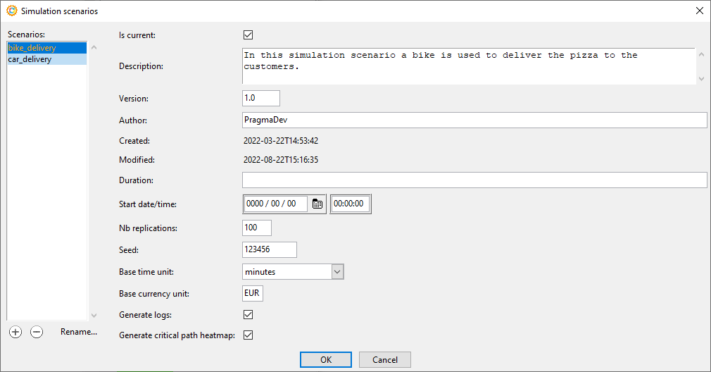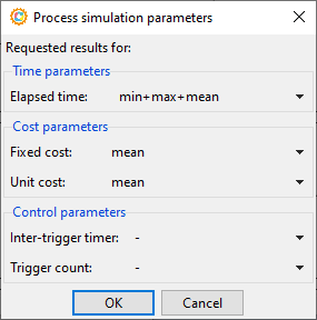 In the active scenario, the time and cost information is defined for each BPMN symbol in the model. BPSim defines a wide range of possibilities from a fixed value to several distributions for time, as well as fixed and variable information for cost. A resource can also be required, by name or by role, to achieve the activity. If the resource is unavailable the waiting time is added to the process execution.